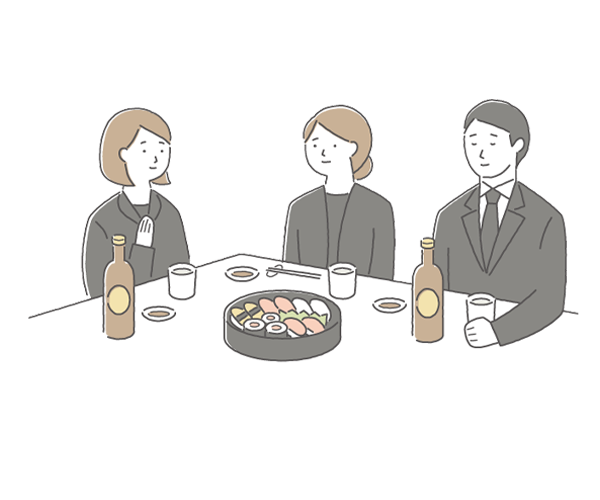 お通夜(故人様を偲ぶための儀式)を行い、家族葬に参列された親族や親しい友人と料理(通夜振舞い)を囲みます。